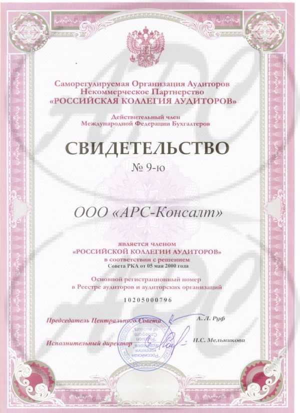 С 5 мая 2000г. по 29 сентября 2016г. Общество с ограниченной ответственностью «АРС-Консалт» являлось членом Саморегулируемой организации аудиторов НКО "Российская Коллегия Аудиторов" (Свидетельство от от 05.05.2000г.).