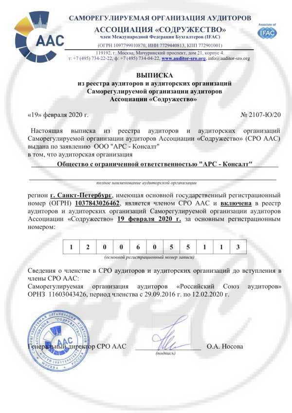 Организации Аудиторов Ассоциация «Содружество» (Выписка от 19.02.2020г.).