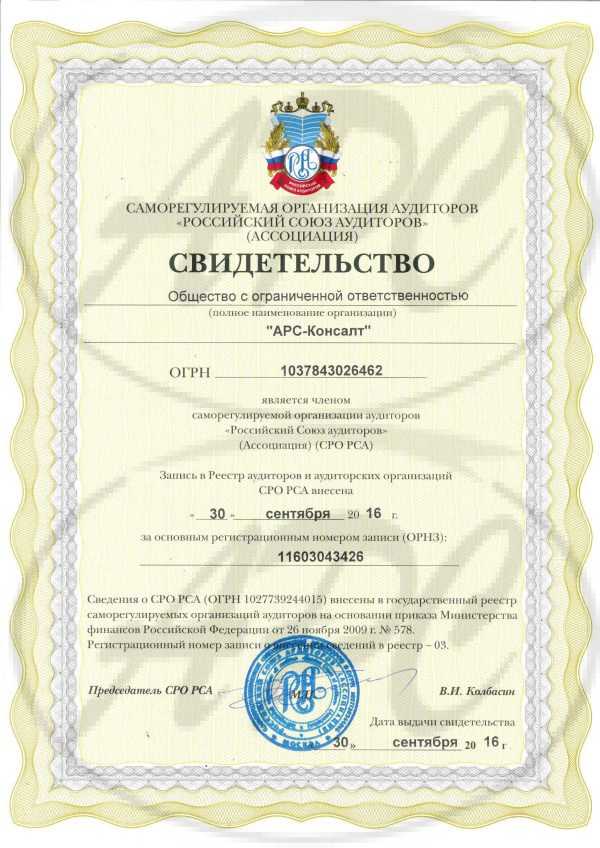 С 5 мая 2000г. по 29 сентября 2016г. Общество с ограниченной ответственностью «АРС-Консалт» являлось членом Саморегулируемой организации аудиторов НКО "Российская Коллегия Аудиторов" (Свидетельство от от 05.05.2000г.).